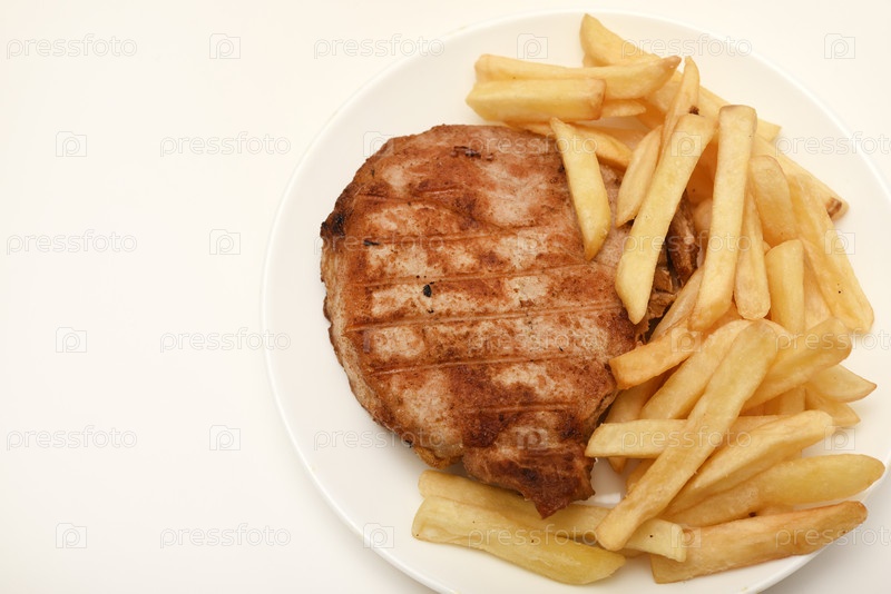 Жареная свиная корейка с жареным картофелем. Вкусный мясной завтрак. Картофель фри