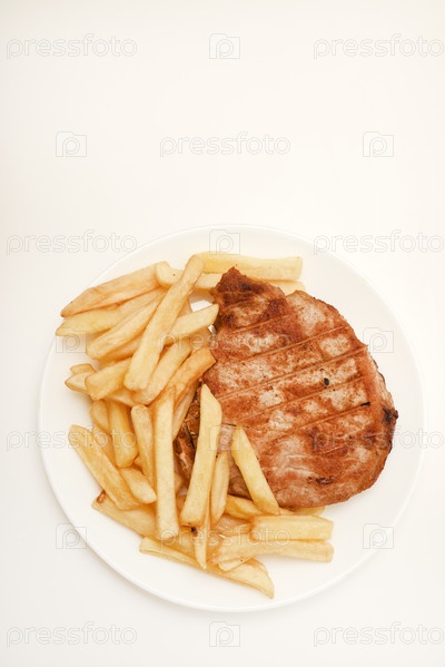 Жареная свиная корейка с жареным картофелем. Вкусный мясной завтрак. Картофель фри