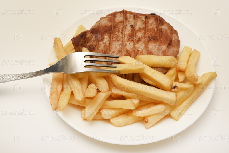 Жареная свиная корейка с жареным картофелем. Вкусный мясной завтрак. Картофель фри