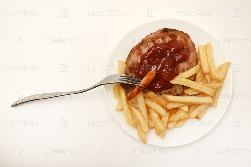 Жареная свиная корейка с жареным картофелем. Вкусный мясной завтрак. Картофель фри