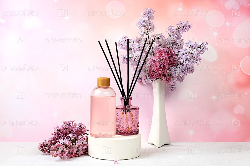 Спа и велнес композиция с сиреневой водой, розовой солью, ароматическими палочками и свежими цветами сирени, рекламная карточка спа-салона с местом для текста. Концепция естественного ухода за собой и здорового образа жизни, абстрактная композиция с цвета