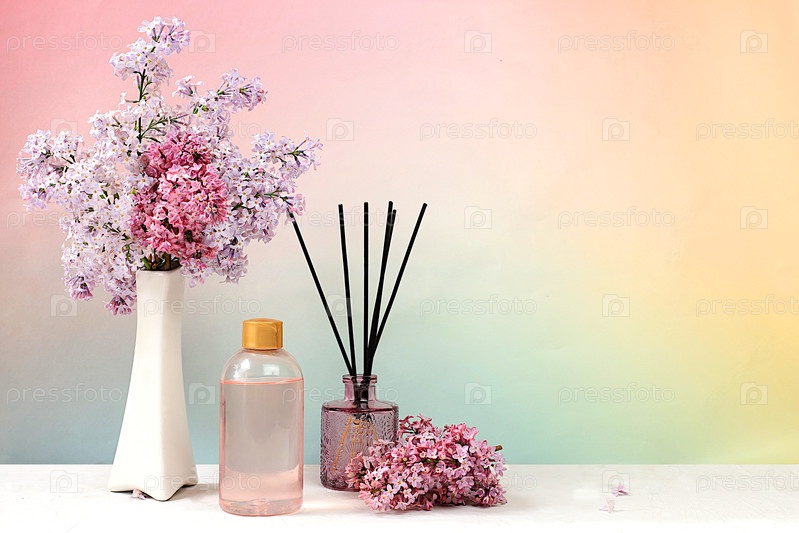Спа и велнес композиция с сиреневой водой, розовой солью, ароматическими палочками и свежими цветами сирени, рекламная карточка спа-салона с местом для текста. Концепция естественного ухода за собой и здорового образа жизни, абстрактная композиция с цвета