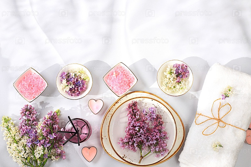 Спа и велнес композиция с сиреневой водой, розовой солью, ароматическими палочками и свежими цветами сирени, рекламная карточка спа-салона с местом для текста. Концепция естественного ухода за собой и здорового образа жизни, абстрактная композиция с цвета