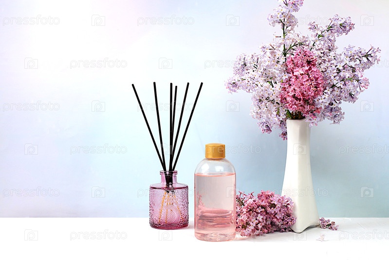 Рекламная открытка спа-салона с местом для текста. Спа и велнес-композиция с сиреневой водой, розовой солью, ароматическими палочками и свежими цветами сирени, концепция естественного ухода за собой и здорового образа жизни, абстрактная композиция с цвета