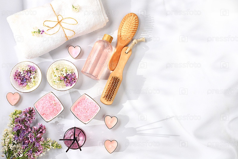 Спа и велнес композиция с сиреневой водой, розовой солью, ароматическими палочками и свежими цветами сирени, рекламная карточка спа-салона с местом для текста. Концепция естественного ухода за собой и здорового образа жизни, абстрактная композиция с цвета