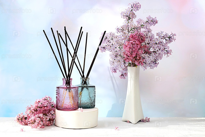Рекламная открытка спа-салона. Оздоровительная композиция с ароматическими палочками сирени и свежими цветами сирени, концепция естественного ухода за собой и здорового образа жизни, абстрактная композиция с цветами