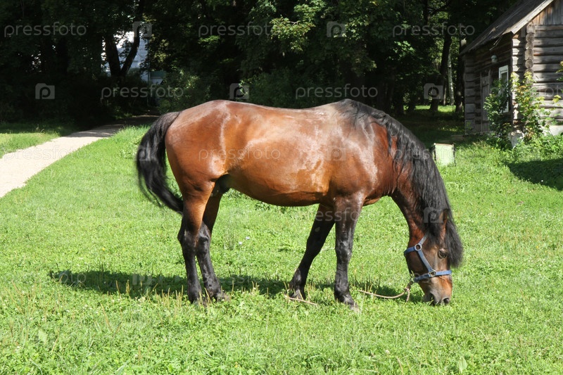 Летний покой. Грациозная гнедая лошадь, спокойно пасущаяся на зеленом лугу