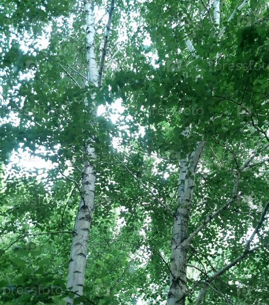 Пышная зеленая крона берез ясным летним солнечным утром