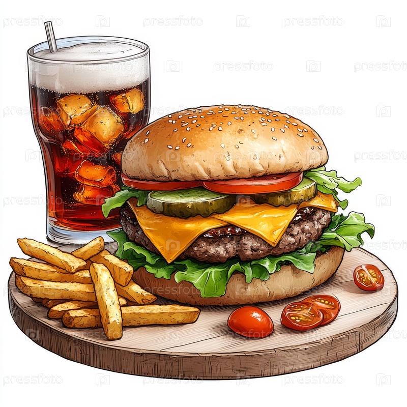 Вкусный гамбургер с расплавленным сыром, картофель фри и освежающий напиток для настоящих гурманов