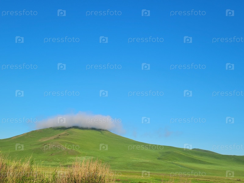 Белое облако в виде шапки на вершине зеленого холма на фоне голубого неба
