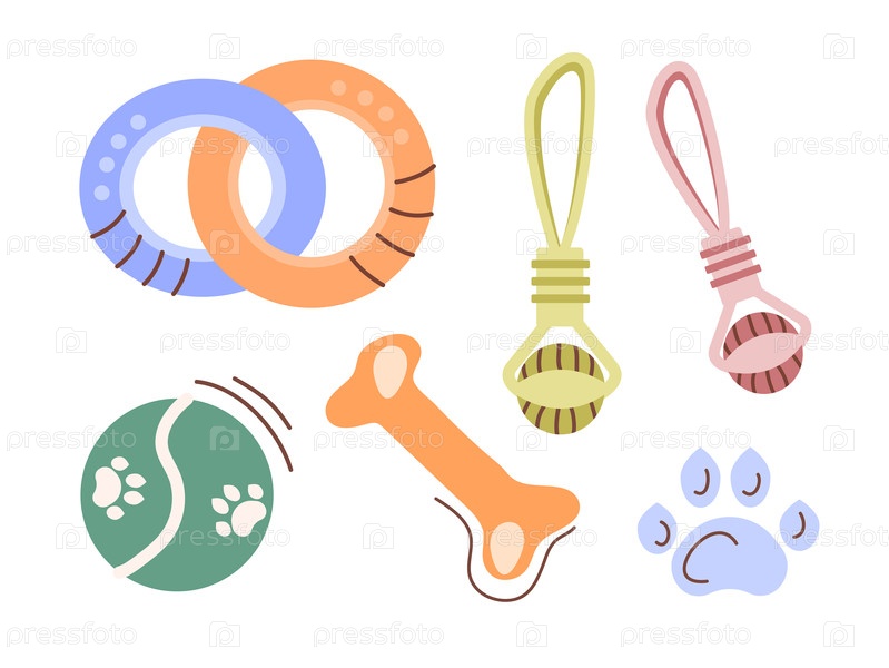 Набор плоских красочных иллюстраций с аксессуарами для собак, игрушками для животных, товарами для дрессировки