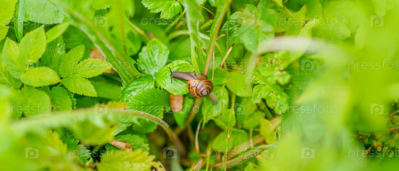 Улитка на стебле среди зелени