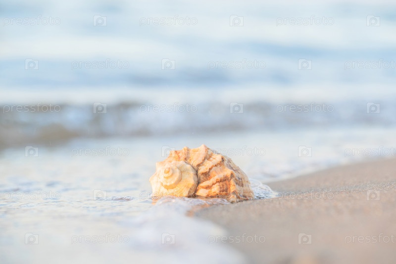 Красивая ракушка лежит на пляже, рядом с лазурной водой моря