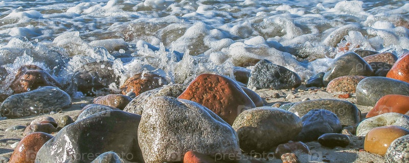 Морская пена на мокрой гальке на пляже в солнечный день, крупный план
