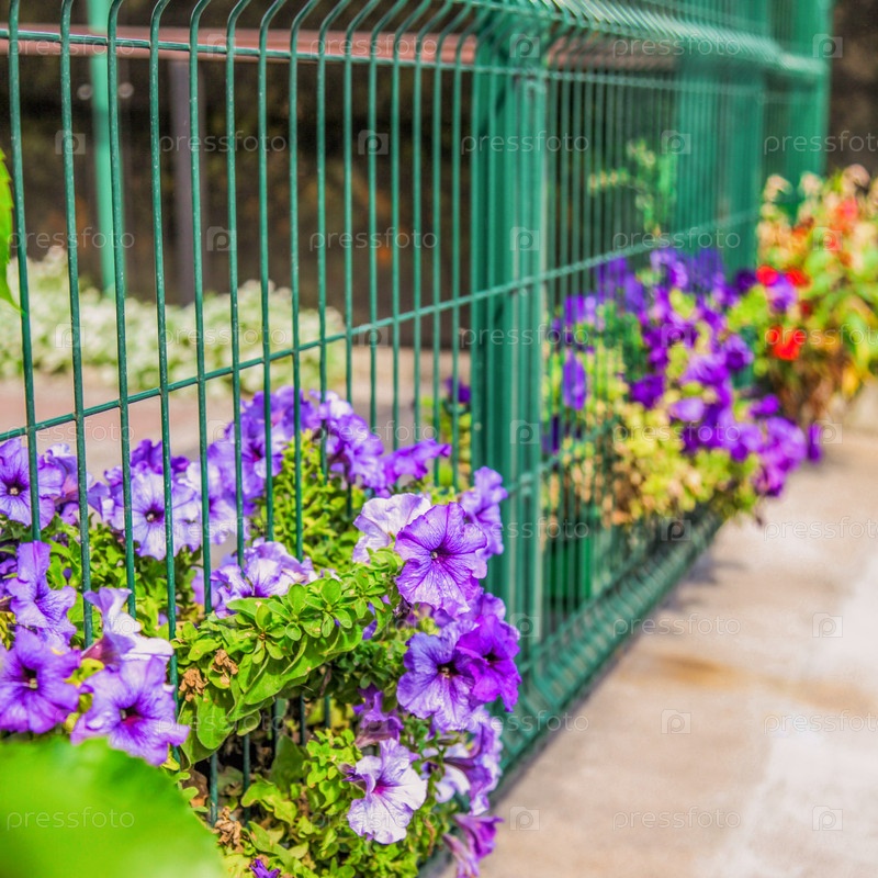 Фиолетовые цветы, выглядывающие из-за забора на тротуар