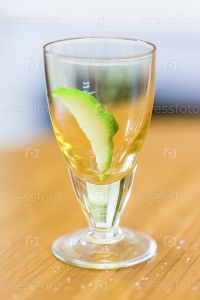 Стопка с ломтиком лайма на деревянном столе, крупный план, размытый фон
