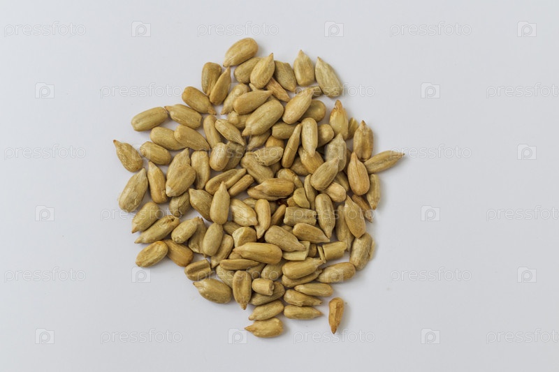 Крупный план очищенных семян подсолнечника на белом фоне. Еда