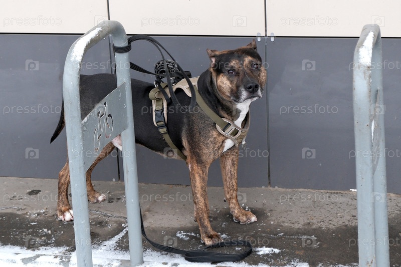 Сабака бойцовской породы привязанная на стоянке для велосипедов