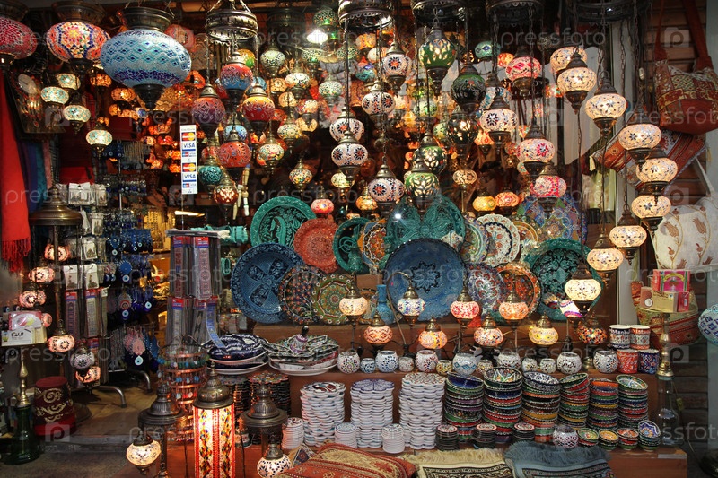 Красочные фонари и керамические изделия на рынке, демонстрирующие традиционные ремесла