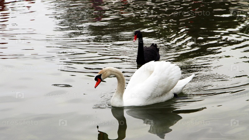 Контрасты природы. Два грациозных лебедя — один белый, другой черный — плывущие по водной глади