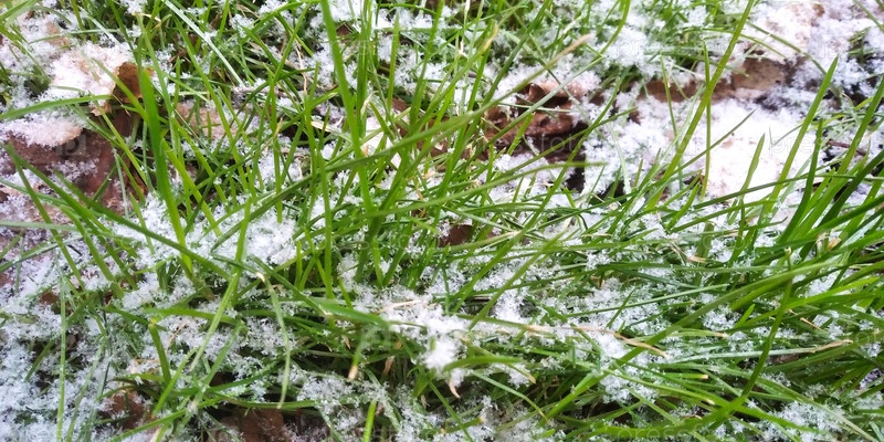 Молодая зеленая весенняя трава пробивается сквозь тонкий слой тающего снега