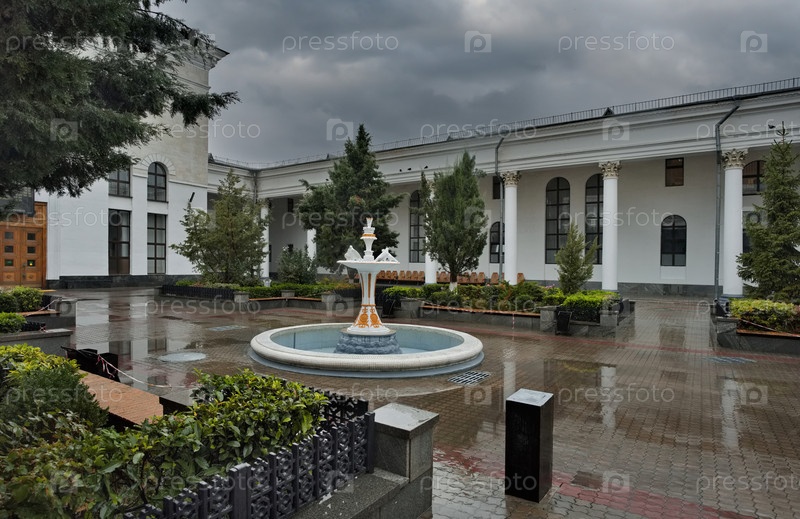 Симферополь, Россия. 01 октября 2024 года. Необычная архитектура привокзальной площади с колоннадой и парком в дождливый осенний день