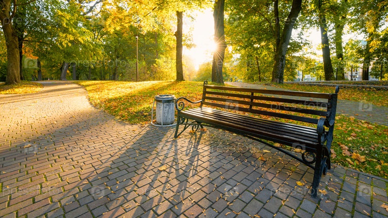 Скамейка в осеннем парке, желтая листва и яркое солнце