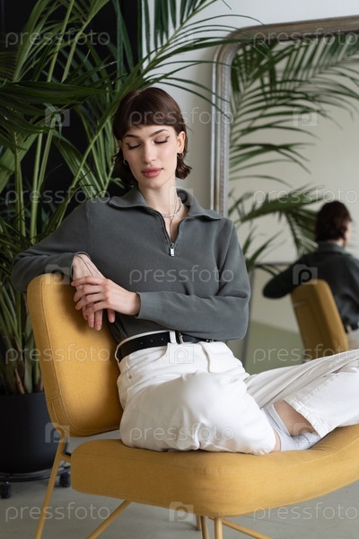 Молодая красивая женщина сидит в кресле в студии в свитере