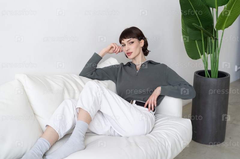 Молодая красивая женщина сидит в кресле в студии в свитере