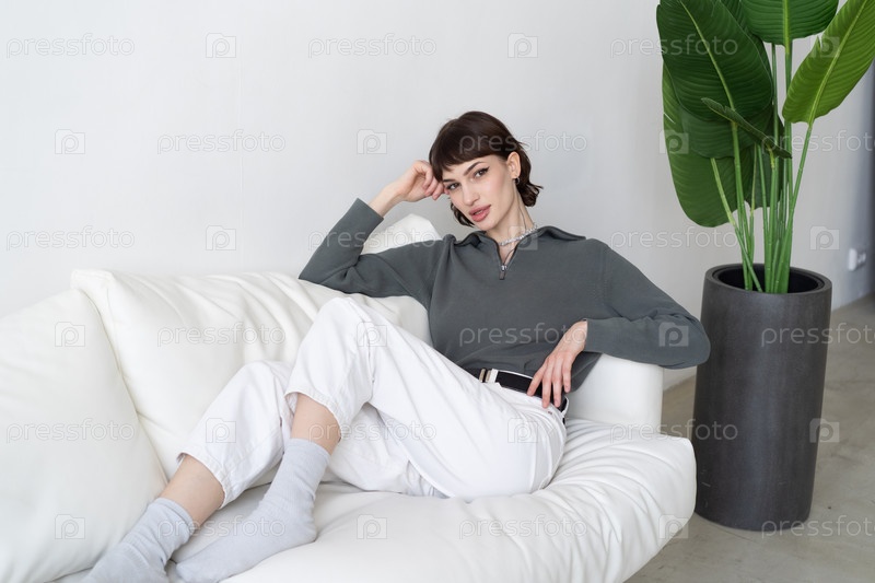 Молодая красивая женщина сидит в кресле в студии в свитере