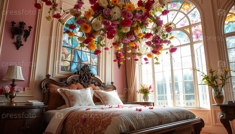 Роскошный интерьер с кроватью и цветами. Генеративный искусственный интеллект