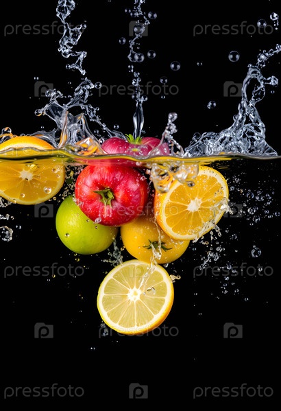 Различные фрукты, падающие в воду. Генеративный искусственный интеллект