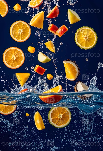 Различные фрукты, падающие в воду. Генеративный искусственный интеллект