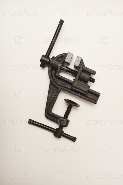 Маленькие металлические тиски на белом фоне. Зажим. Инструмент для слесарного дела