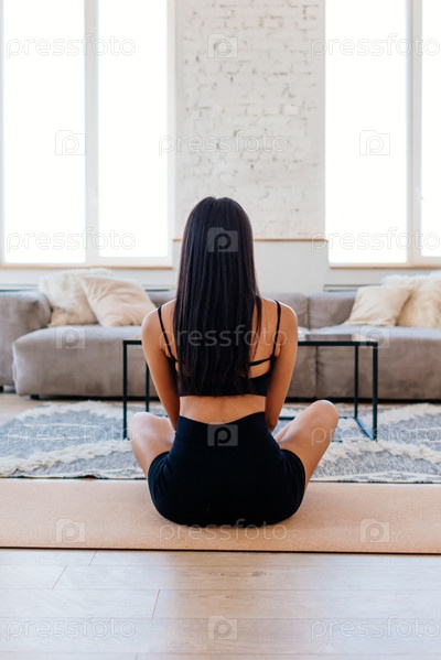Женщина сидит на полу в медитативной позе, скрестив ноги. Она отворачивается от камеры, одета в черную спортивную одежду, спортивный бюстгальтер и шорты