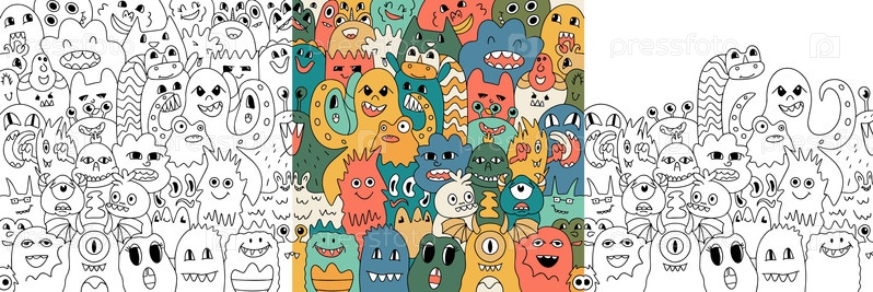 Смешный большой плакат с милыми монстрами в стиле doodle. Ручно нарисованные инопланетяне. Красивые разноцветные иллюстрации и краски. Дизайн для детей, комиксов, образования. Вектор