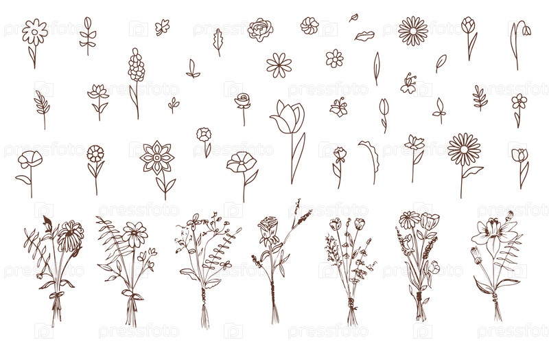 Коллекция цветов, поле, луг, в линейном стиле. Нарисованные вручную цветы. Минималистичный дизайн красивых цветов на белом фоне. Вектор