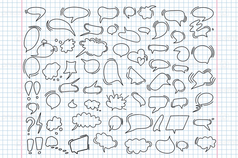 Огромный набор диалоговых окон, различные варианты нарисованы вручную. Коллекция речевых пузырей для разговора, диалога, дизайн в стиле каракули на клетчатом фоне. Вектор
