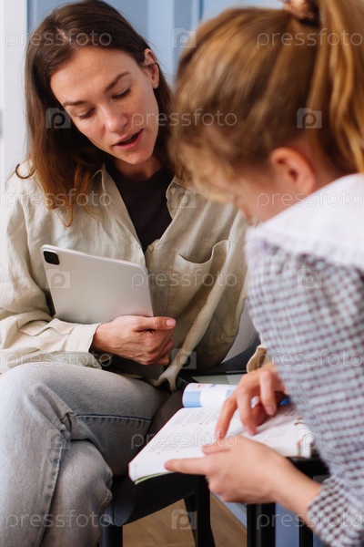 Частный репетитор женского пола помогает молодому ученику с домашним заданием, урок на дому