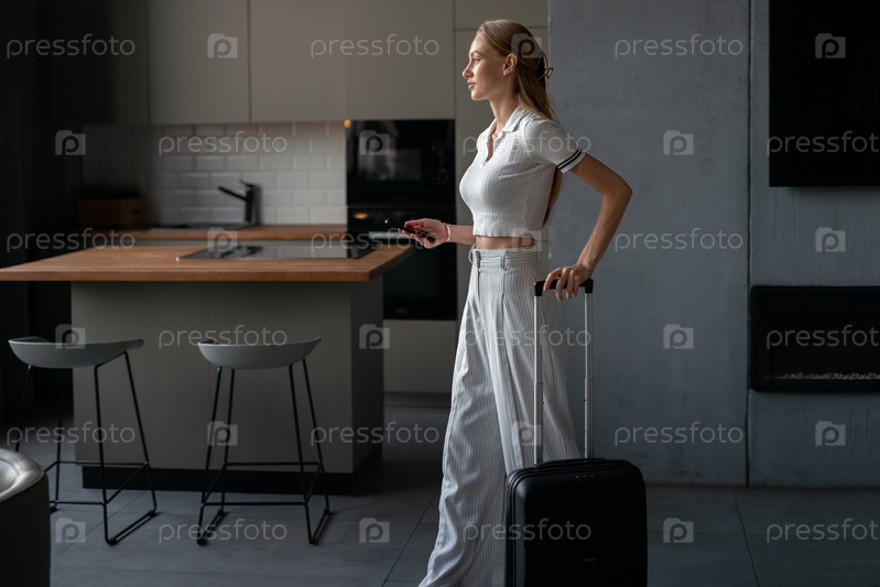 Бронирование путевки и размещение. Молодая женщина с чемоданом в съемной квартире