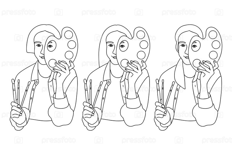 Молодая женщина с палитрой и художественными кистями в руках. Концепция рабочего процесса художника. Логотип художника