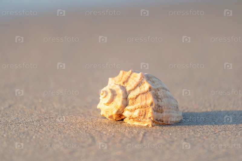 Красивая ракушка лежит на пляже, рядом с лазурной водой моря