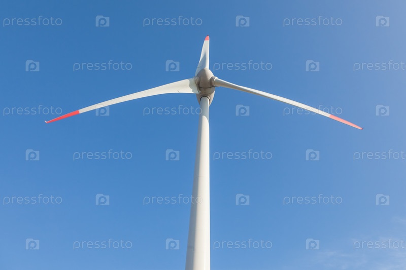 Ветряная турбина с солнечными бликами на фоне голубого неба, вид снизу