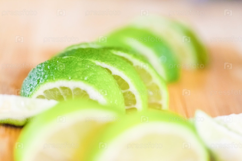 Ломтики лайма на деревянном столе, крупный план размытого фона