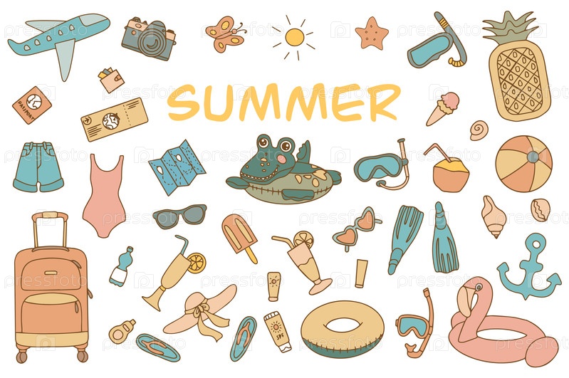 Красочные пляжные принадлежности и аксессуары элементы в стиле каракули. Нарисованные от руки пляжные принадлежности и спортивный инвентарь. Векторная иллюстрация. Белый фон