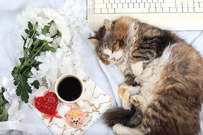 Современный женский рабочий стол, уютный домашний офис со спящей кошкой, концепция дня матери, женский день. Компьютер, кофе, красные сердца, цветы и пирожные на светлом одеяле, здоровый образ жизни, плоская планировка, выборочный фокус