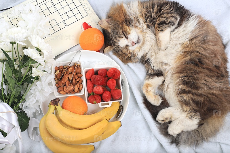 Здоровый завтрак с ингредиентами, уютный домашний офис со спящим котом. Клубника, орехи и фрукты на легком одеяле, концепция детокс-диеты, здоровый образ жизни, современный рабочий стол для женщин, плоская планировка, выборочный фокус
