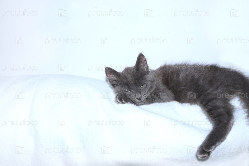 Крупный план спящего кота на светлом фоне с местом для текста. Уютный дом с домашними животными, открытка или плакат ветеринарной клиники, магазина, реклама, селективный фокус