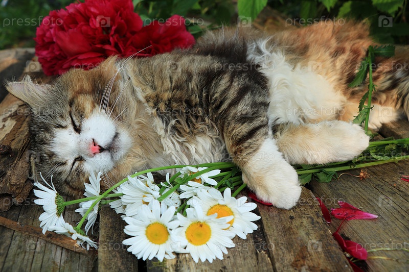 Счастливый спящий деревенский кот в ромашках летом на деревянном столе. Уютная деревенская жизнь в саду для домашних животных