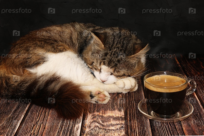 Кофе латте и спящий кот на темном деревянном столе. Тепло нашего дома окружено счастливым питомцем. Кофе и кот согреют нас холодными осенними вечерами